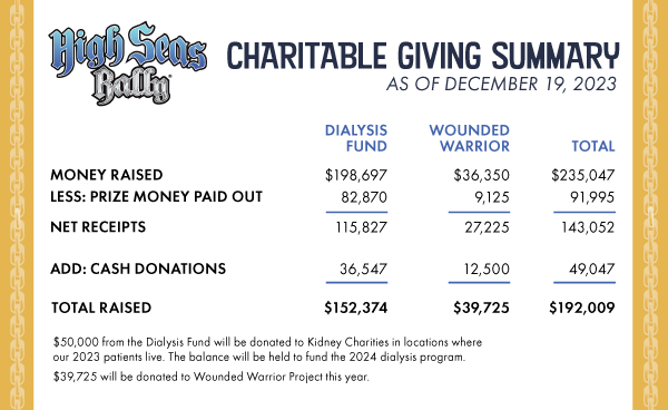 Please Note: High Seas Rally Dialysis Fund has no employees, contractors, etc., and pays no salaries or other forms of compensation to anyone. 100% of net funds raised in 2023 will be distributed to charity, or used to fund the 2024 High Seas Rally program.